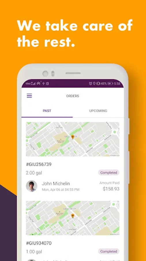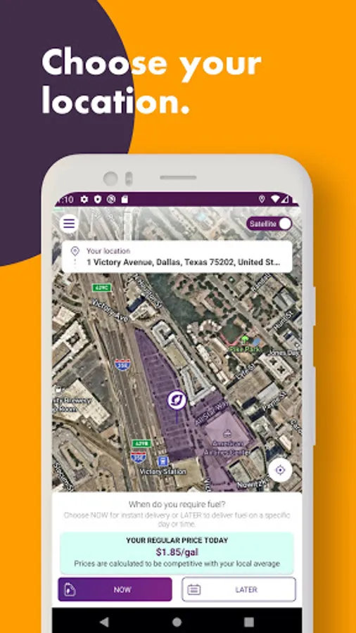 Enter your address and drop the pin near your parked location. Select whether you need fuel “Now” or “Later”, fill out your vehicle profile, and have a credit card number ready to place your order.