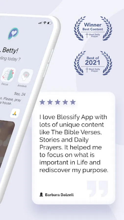By joining Blessify, you’ll enjoy a large variety of Calming Bible Stories, Inspiring Bible Verses, Meditative & Healing Prayers, Empowering Sermons, Praise & Worship Songs, and Stories From the Community that you can listen to or read whenever you like.