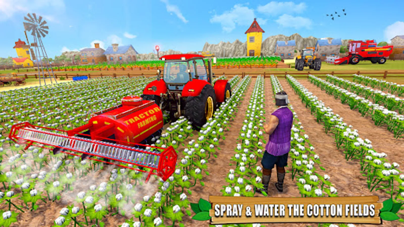 Control tractors in a farming game open-world 3D landscape.