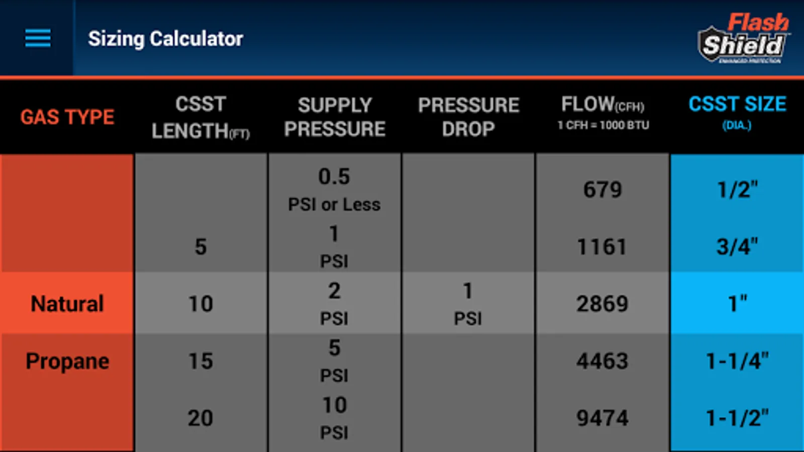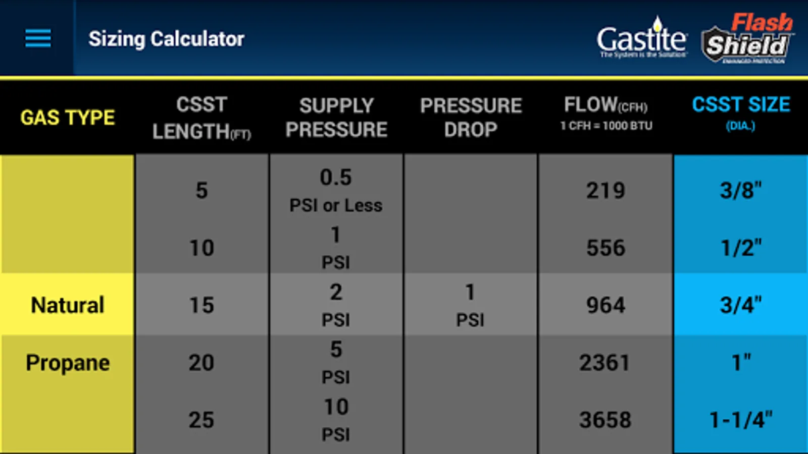 The Gastite and FlashShield flexible gas piping systems are designed and warranted to provide sufficient gas volume and pressure for proper appliance performance using the appropriate sizing tables and methods detailed in the Design and Installation Guide and this Mobile Sizing App.