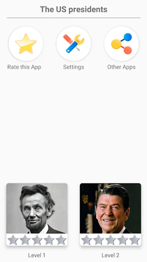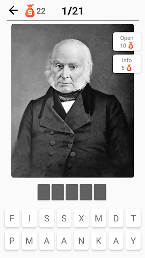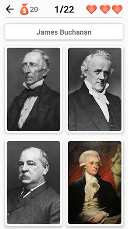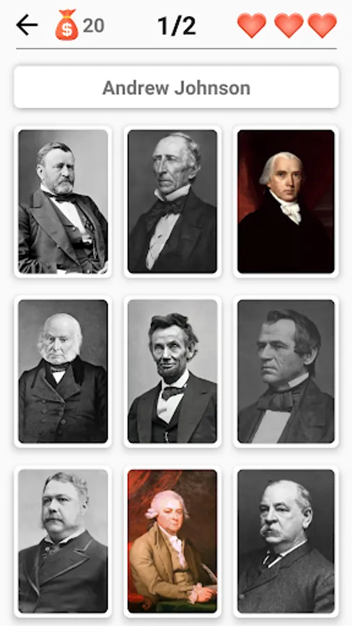 1) level 1: first 22 presidents. George Washington, Abraham Lincoln and John Adams. US Founding Fathers and key characters in American History.