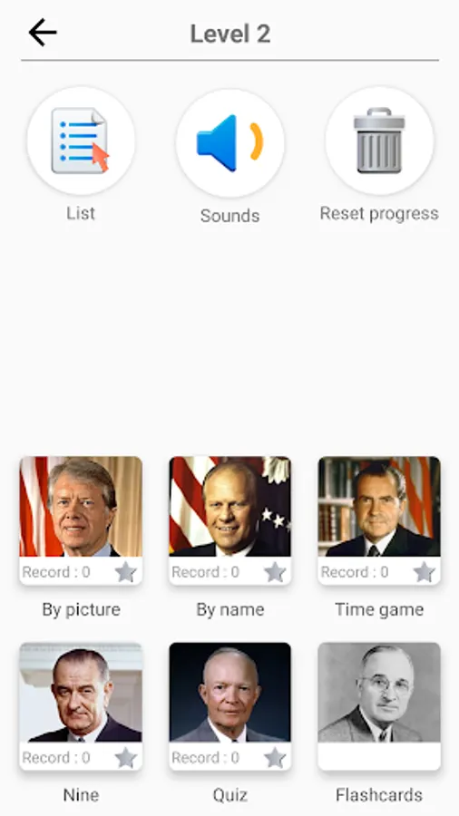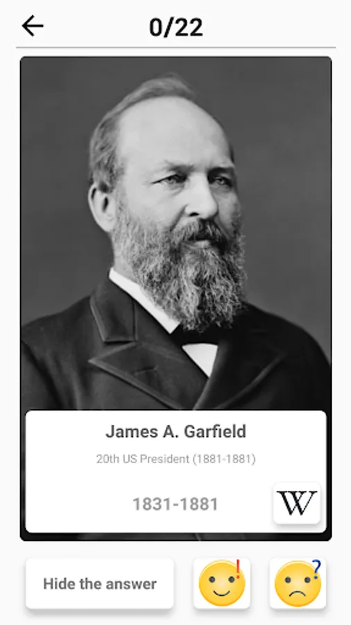 • Flashcards: A link to the full biography of each person in the encyclopedia and a brief biographical info. You can regulate your studies by marking the outstanding president you already know to avoid further repetition and by highlighting the ones you would like to revise.