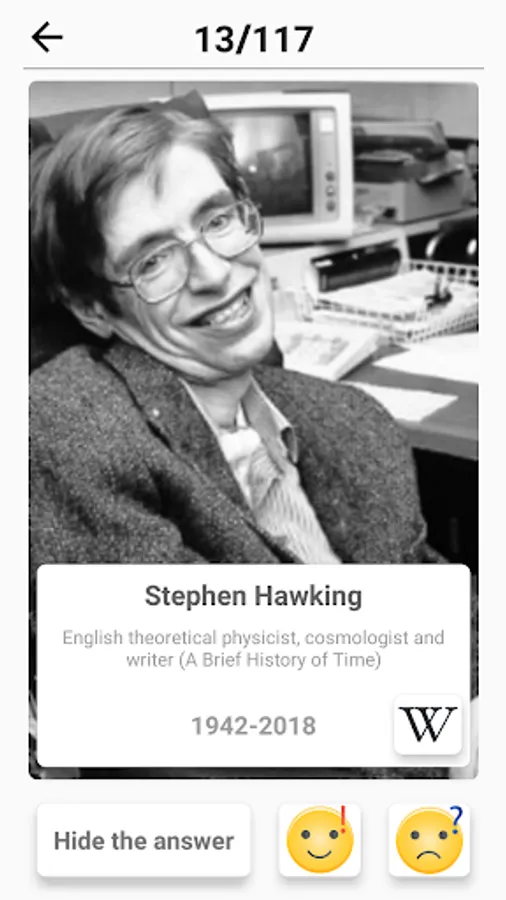 • Flashcards: A link to the full biography of each person in the encyclopedia and a brief biographical info. You can regulate your studies by marking the outstanding famous people you already know to avoid further repetition and by highlighting the ones you would like to revise.