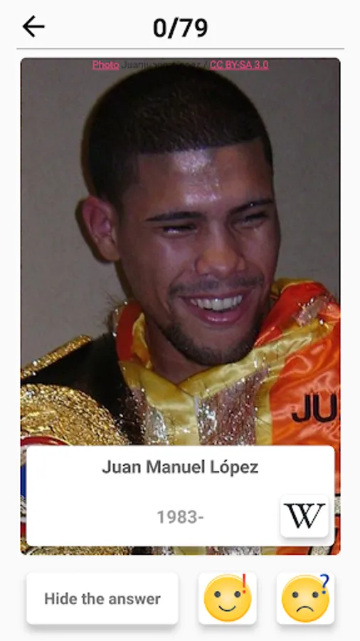 • Flashcards: A link to the full biography of each fighter in the encyclopedia and a brief biographical info. You can regulate your studies by marking the outstanding a boxer you already know to avoid further repetition and by highlighting the ones you would like to revise.