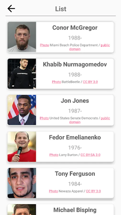 In this game you will find more than 150 most recognizable MMA fighters and boxers in the world history. Learn the best MMA fighters: from Conor McGregor and Khabib Nurmagomedov to Fedor Emelianenko and Jon Jones. Guess the great boxers: from Floyd Mayweather Jr. and Klitschko brothers to Mike Tyson and Muhammad Ali.