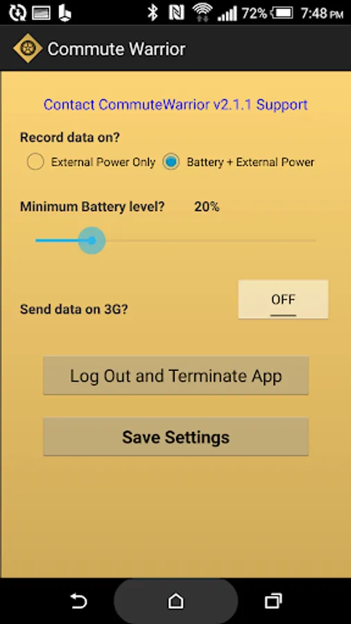 Commute Warrior allows the user to set a battery level that, when reached, automatically discontinues the operation of the CW App. This feature helps ensure user battery levels remain above desired levels.