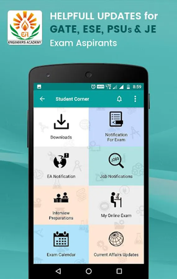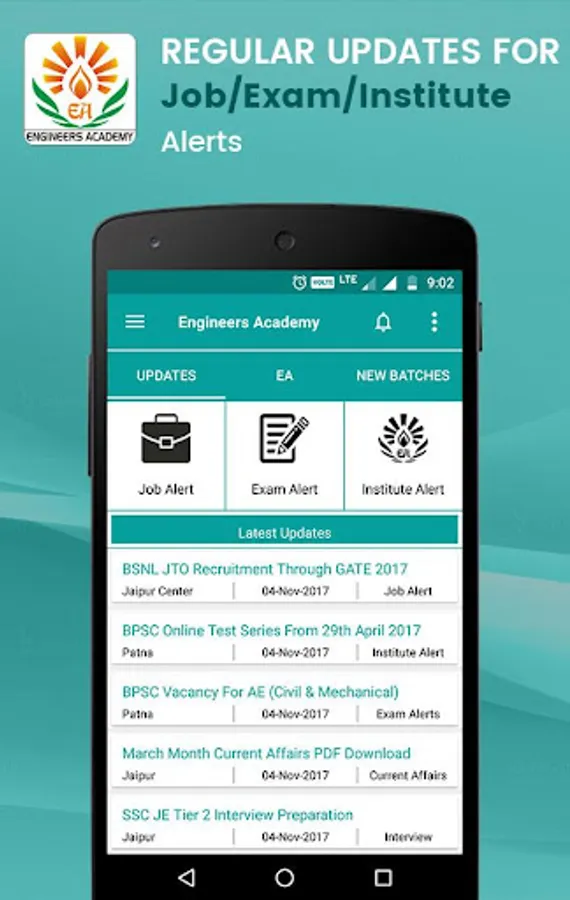In Engineers Academy Free Mobile android App users will get notifications for regular institute alerts, job alerts, exam alerts, Latest news and events etc. Engineers Academy App also provides following features for users: