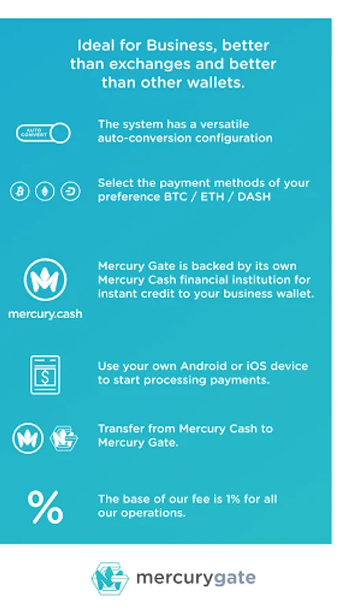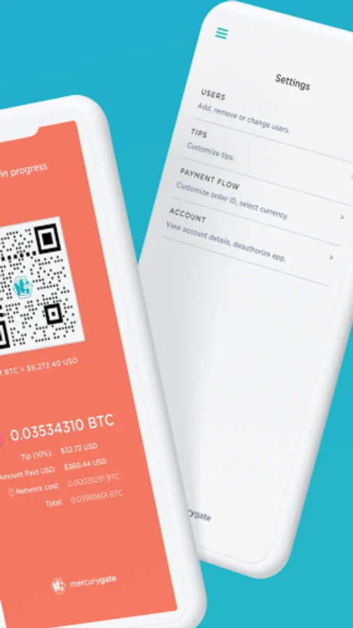 Mercury Gate POS Application allows you to collect payments in the most popular cryptocurrencies BTC, ETH and DASH with just a few steps and in few minutes. It's created for those who manage restaurants, coffee shops, or any retail store.
