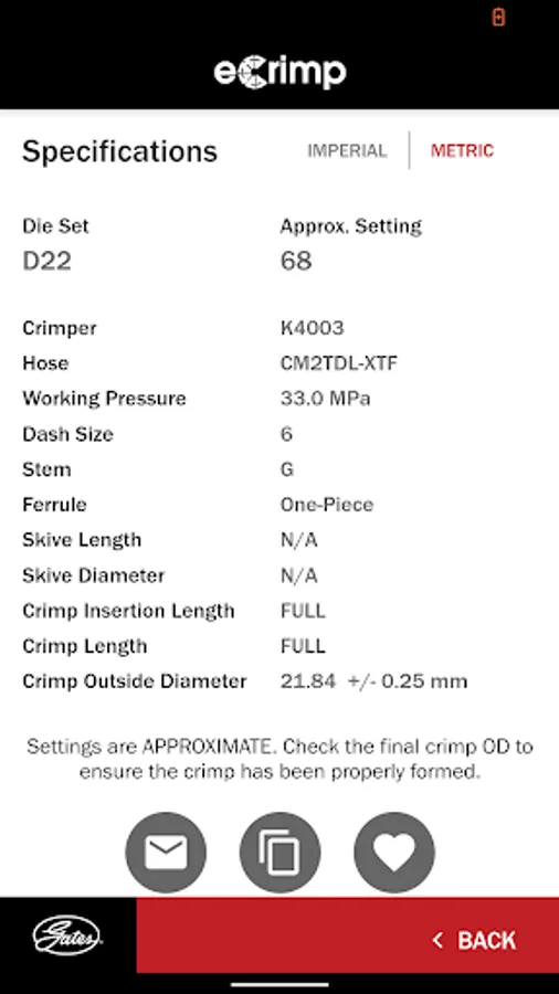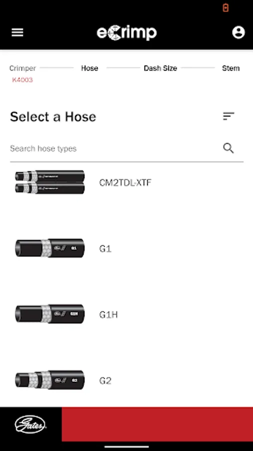 Gates eCrimp is an innovative app that enables users and distributors of Gates hydraulic and industrial hose products to find the most up-to-date crimp specifications quickly and easily. With just a few taps, you'll have all the specs necessary to provide your customers with factory-quality hose assemblies.