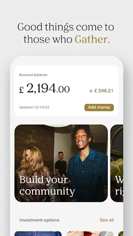 Financial freedom isn’t just for the super-wealthy. We believe that the very best investment opportunities should be available to everyone. Our goal is to demystifying investment and create more than just an investment platform. Gather is also a community where users can connect with inspiring individuals and like-minded investors and learn how others are growing their wealth.