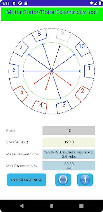 Allows user to determine the eccentricity of a set of stator or rotor field coils using voltage drop in each coil.Handle up to 12 coils.