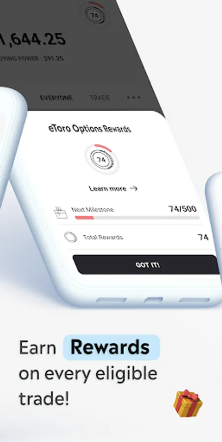 eToro Options allows users to earn rewards when they sign up, when they make their first deposit, and with each eligible trade. Customers can then redeem their rewards for cash at the end of each month. Terms and conditions apply.