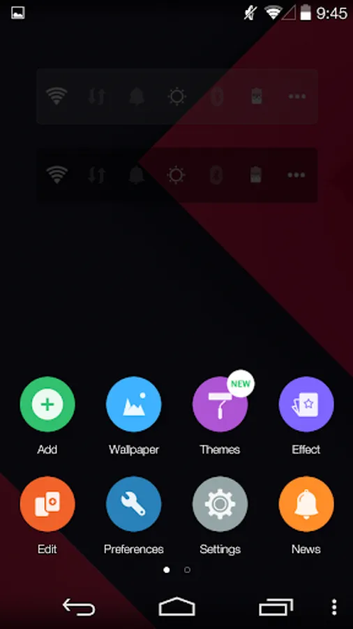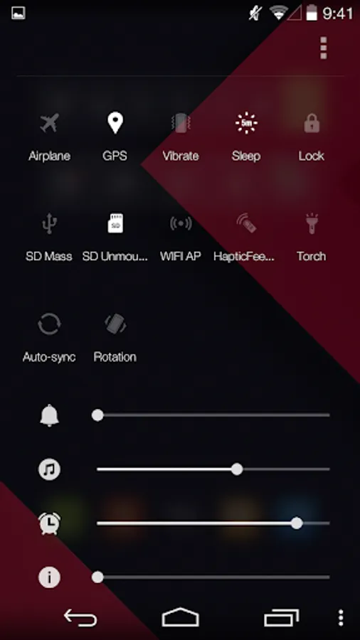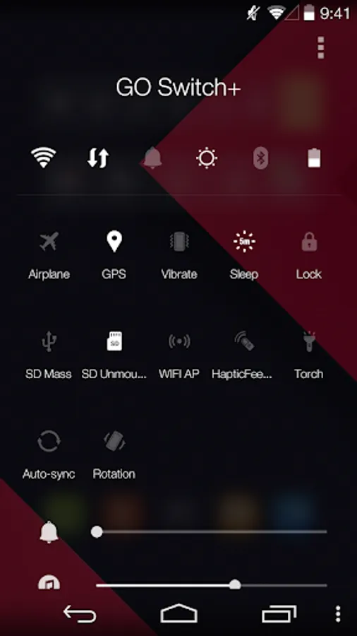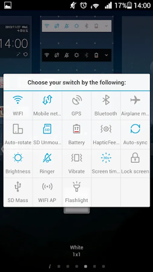 - Wifi, Ringer, Brightness, Bluetooth, MobileNetwork, GPS, Auto-sync, Airplane mode, Auto-rotate, Vibrate, ScreenTimeout, Lock screen, Ringer volume, Media volume