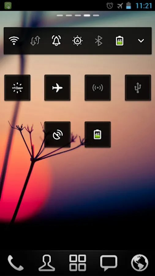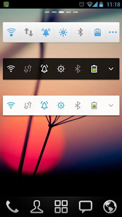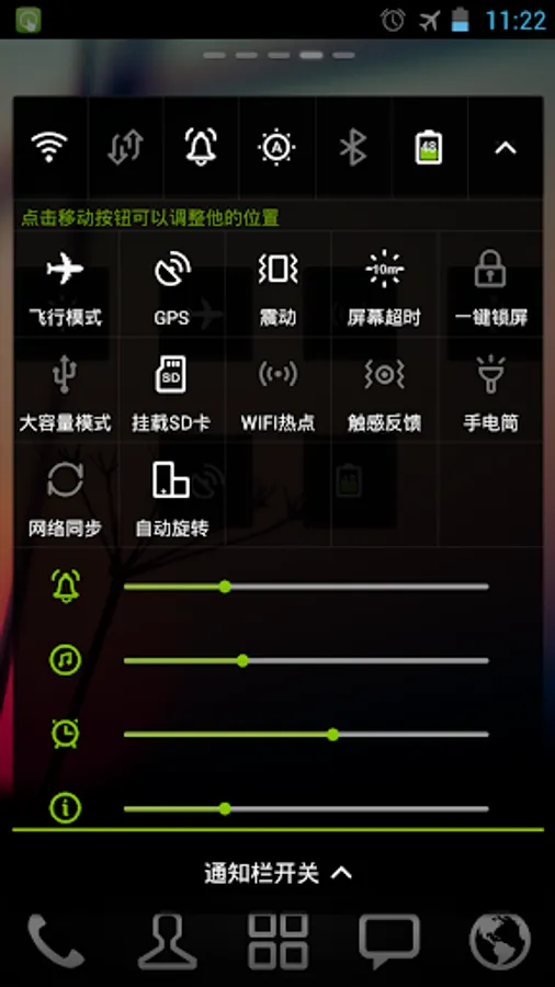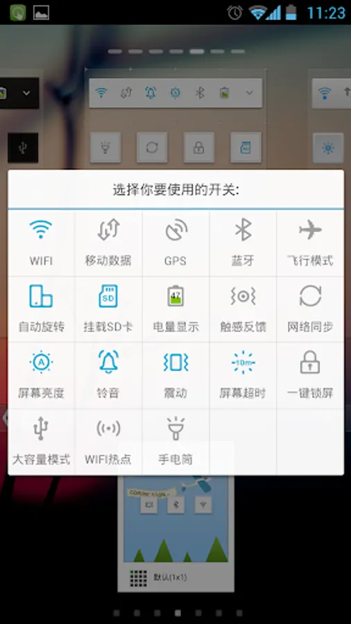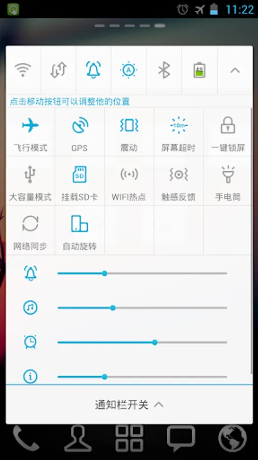 - Wifi, Ringer, Brightness, Bluetooth, MobileNetwork, GPS, Auto-sync, Airplane mode, Auto-rotate, Vibrate, ScreenTimeout, Lock screen, Ringer volume, Media volume