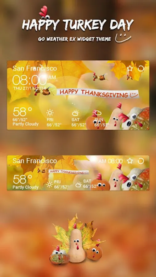 Happy Turkey Day widget, supports 4*1, 4*2, 2*1 sizes. It delivers the most accurate weather information from anywhere at any time.