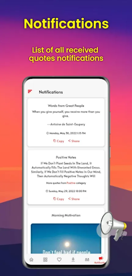 Never miss a moment of motivation! Enable daily quote push notifications to receive a fresh dose of inspiration every morning. Start your day with a positive mindset and stay motivated throughout the day.