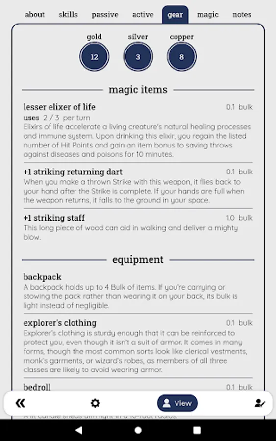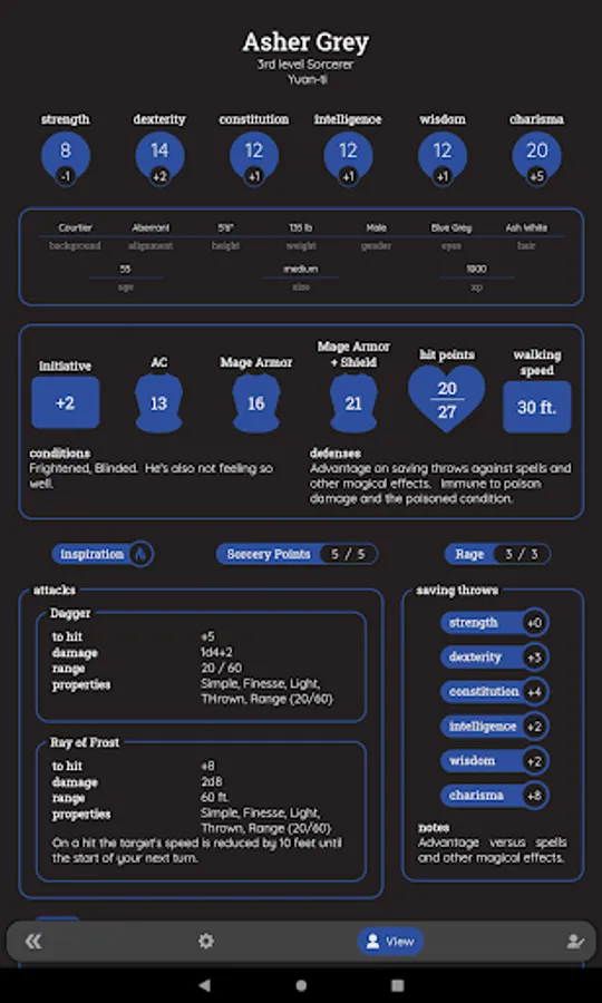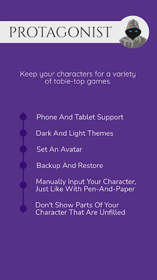 Protagonist lets you keep any number of character sheets for multiple gaming systems. You can assign character portraits, backup and restore your save files, and choose between light and dark themes.