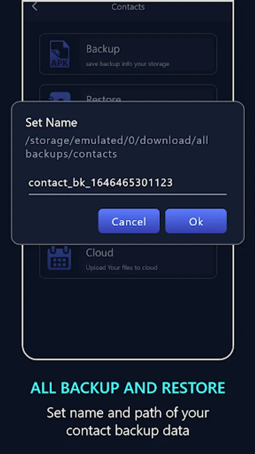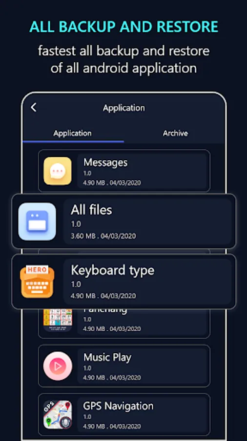 Backup and Restore Allapp help to back up applications, contacts, text message, Call logs, and calendars to your internal storage. you can also Upload your all files to the cloud. It is very simple and easy to use.