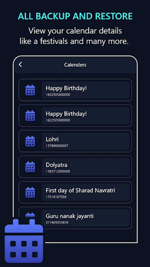 You can create a backup of the details of your event stored in the calendar and can easily restore them in any mobile phone calendar. You can view your events in backup files.