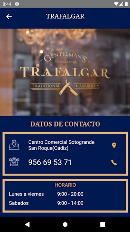 App of the TRAFALGAR BARBER Barbershop in Sotogrande, where clients can easily book their appointments. Get contact information and our products.