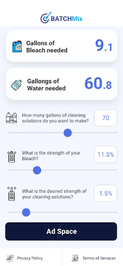 The app will then tell approximately how many gallons of bleach is needed and how many gallons of water is needed to get approximately the desired percentage of SH in your cleaning solution.