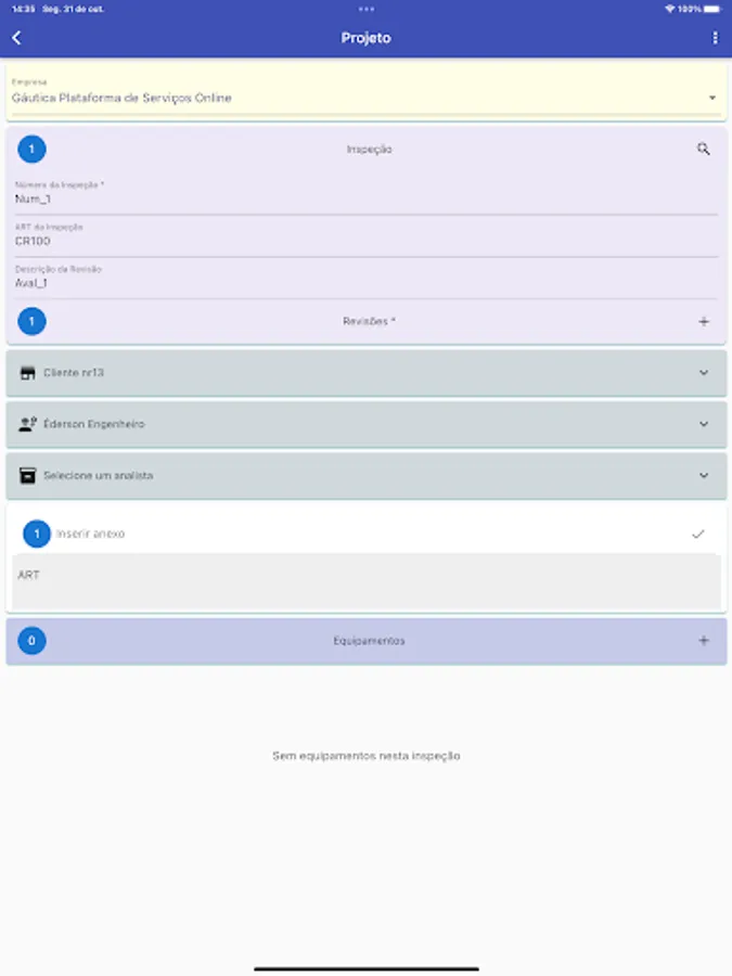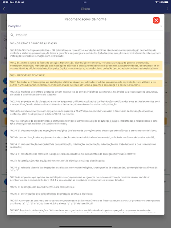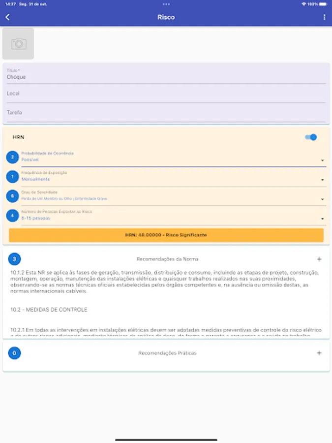 Project registration, creation of safety inspections, inclusion of equipment, which can be electrical panels, substations, energy transformers, among others. The equipments are classified according to their risks, according to the HRN method and safety recommendations according to NR-10 are selected.