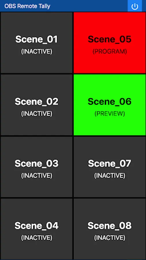 A simple tally light view for OBS Remote. Tap to focus on just one scene. Allows you to see at a glance what state your input (scene) is in.