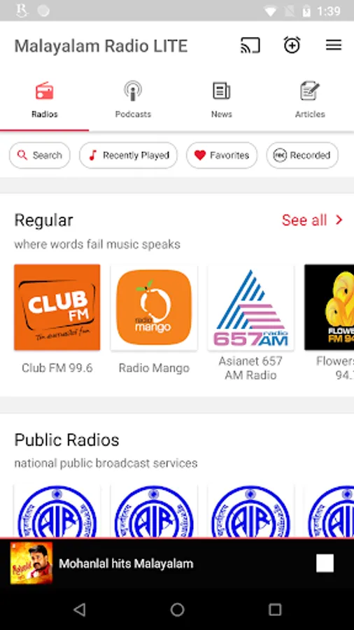 Our FREE radio app has a collection of Regular (top live Malayalam stations), News, Artist, Devotional, and Classic online FMs.