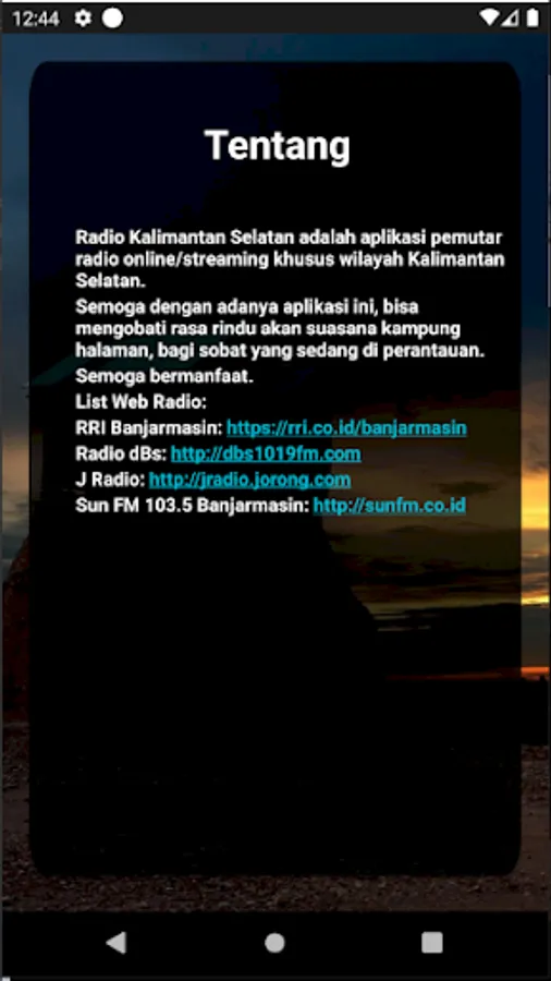 Radio South Kalimantan is a Radio Streaming Application specifically for South Kalimantan Radio, including RRI and several South Kalimantan Local Radios. This application is lightweight and can run on low-end and high-end devices.