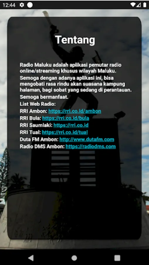 Radio Maluku is a Radio Streaming Application specifically for playing Maluku Radio, including RRI and several Maluku Local Radios, this application is lightweight and can run on low-end and high-end devices.