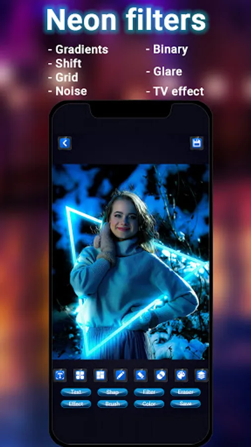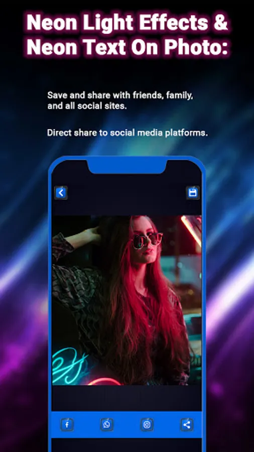 Neon Effect - Photo Editor is the photo editing app you should try. Photo filters looks good but here is something exciting to try. Try Neon Text to Add caption to the image is necessary sometimes, but plain text is boring so this Neon Photo Editor has new cool neon light text.
