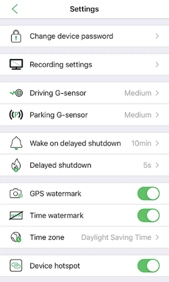Mobile phone operated settings of the dashboard camera.