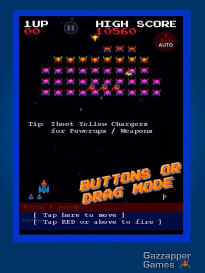 2 Finger Mode: Touch bottom screen to have ship follow your finger and tap screen above the ship to shoot.
