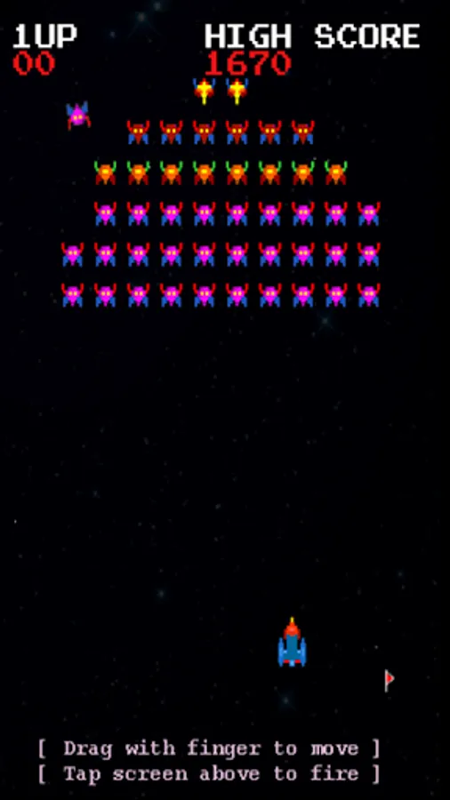 2 Finger Drag Mode: Touch bottom screen to have ship follow your finger and tap screen above the ship to fire.