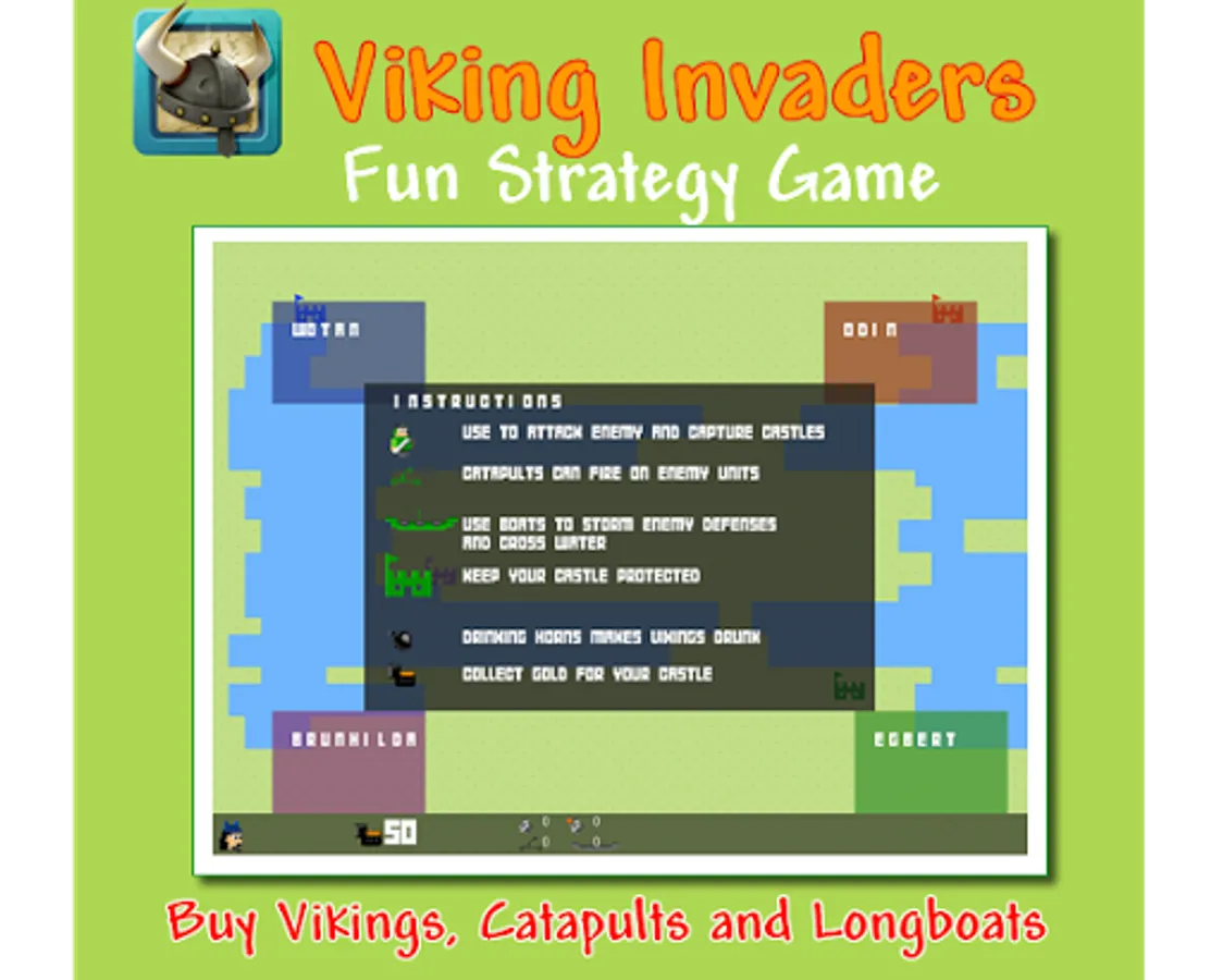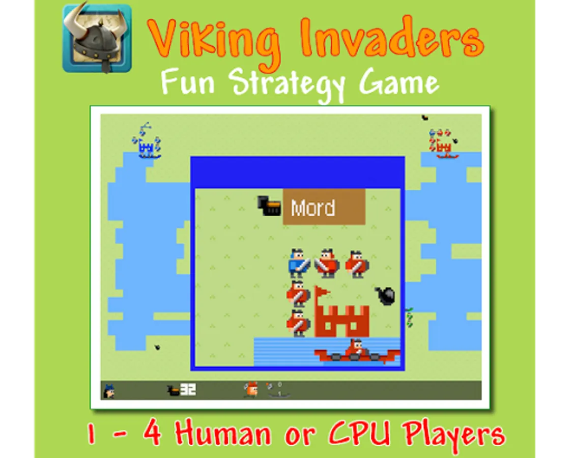 Viking Invaders is a war game for 1 to 4 players. Move your Viking Clan from their castles, fight with swords, fire catapults, board boats and sail down the Fjords, attack enemy castles, seize gold from treasure chests.