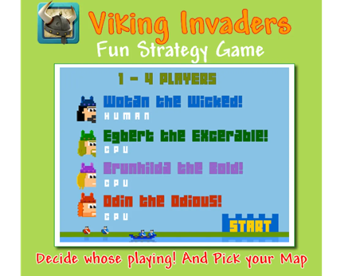 Choose from Wotan the Wicked, Brunhilda the Bold, Egbert the Excerable or Odin the Odious and wage war against your opponents.