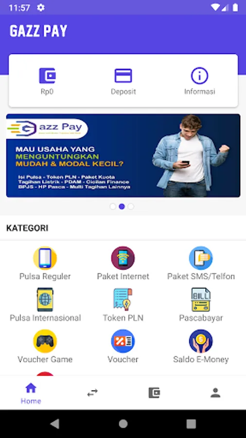 GazzPay is an application for selling cheap pulses of all national-scale operators, we also have a wide variety of products ranging from Credit, Internet Packages, SMS Packages, Transfer Credit, PLN Tokens, Game Vouchers, E-Money Balances, PPOB, and Other Products, Suitable for sold because the price is cheap.