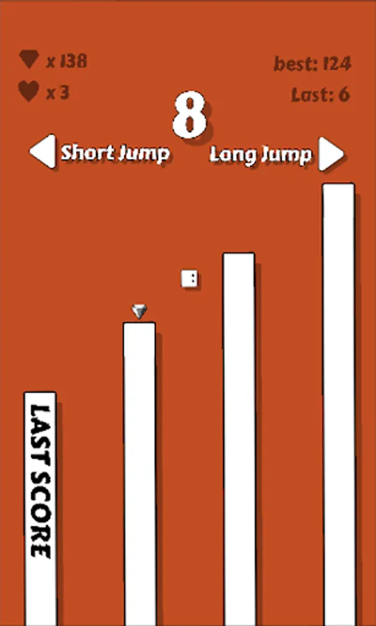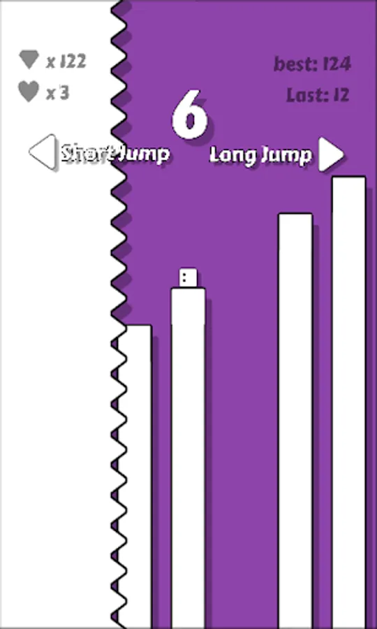 Geometry Jump Free is a very addictive game, "easy to play, hard to master" style. How to play? Just tap at any screen position to move the player. With a short jump you earn one point. With a long jump you earn two points. If you jump and miss a white tile platform, and you don't have any white tile platforms below : you lose! Try to do as many jumps as you can, don't be touched by the big boss wall with spikes coming from the left, continuously, and don't fall by missing tiles. Install Geometry Jump Free now!