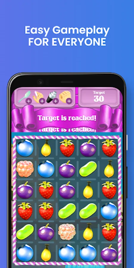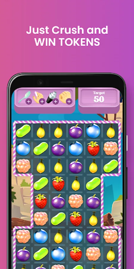 In Game You just need to match 3 or more fruit candies in a single column or row to get points. Every level has its own score requirement. Complete the requirement and Win the Match to get GBank Tokens.