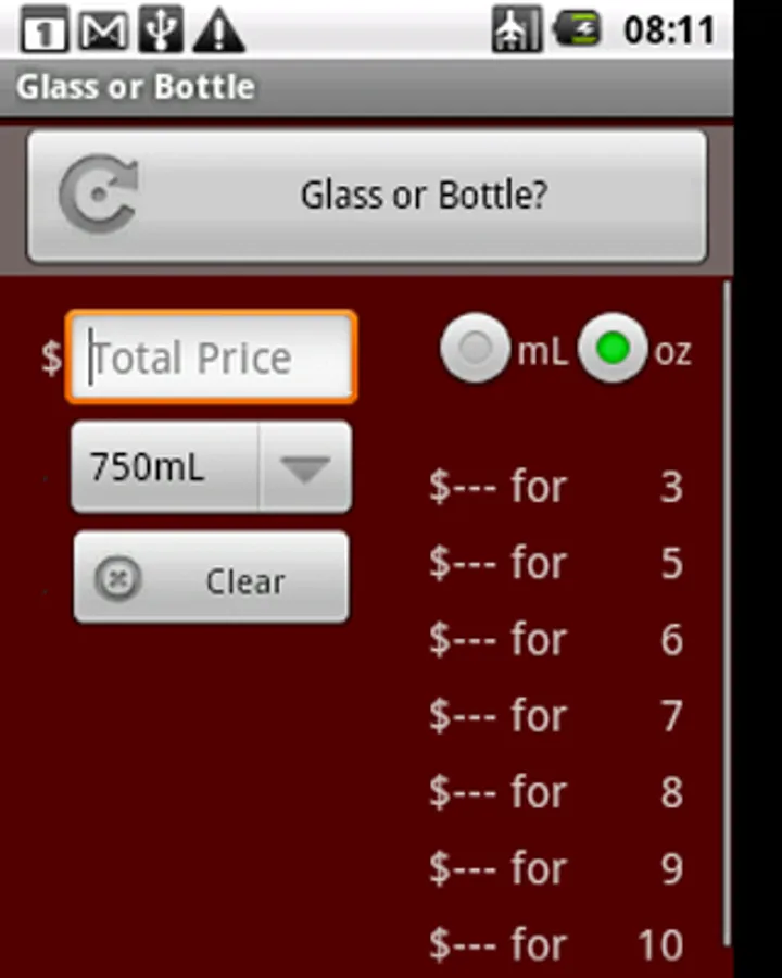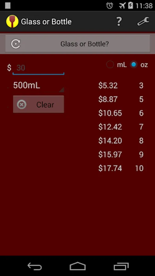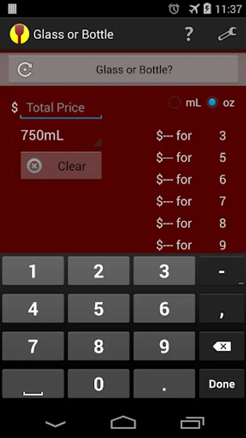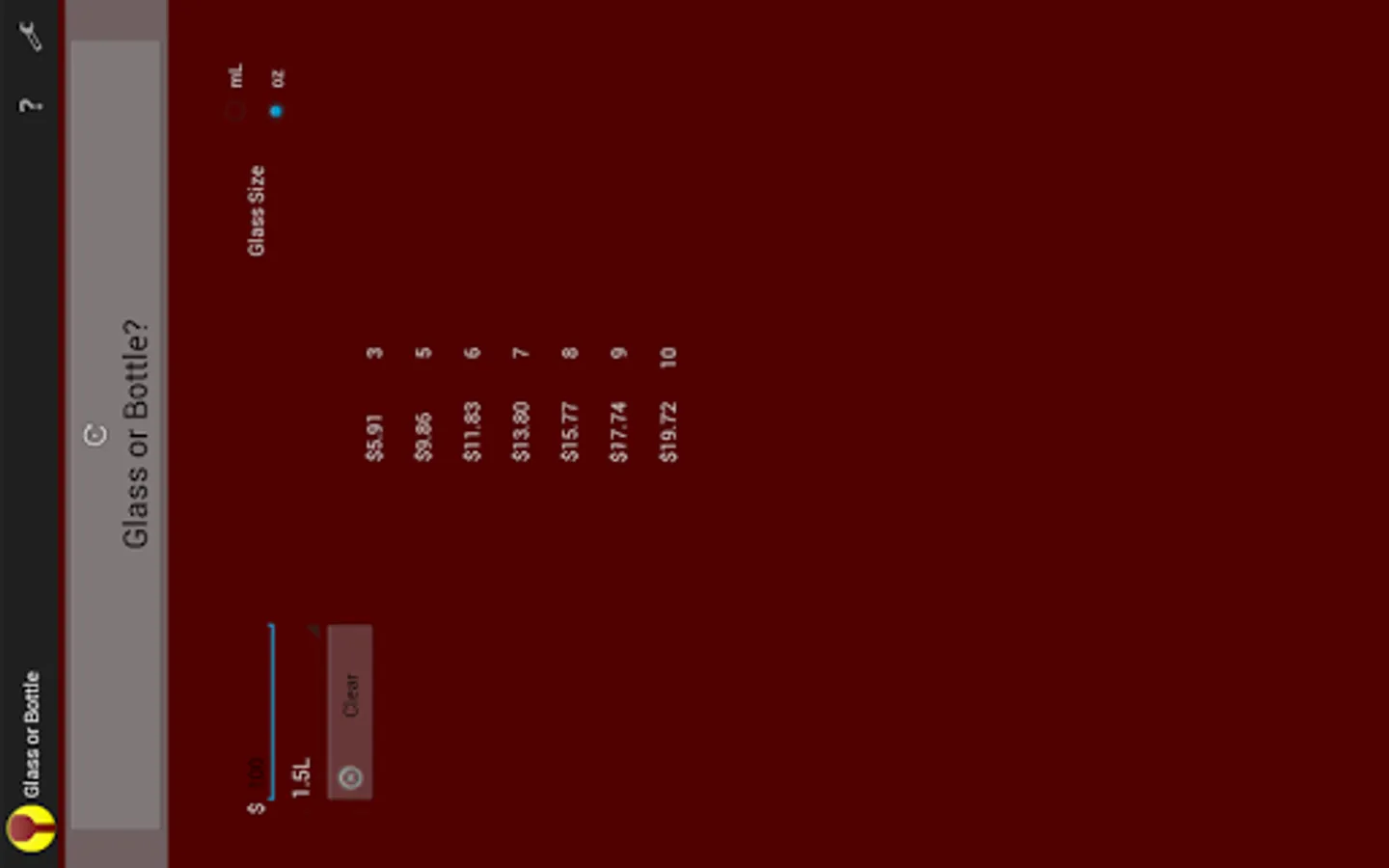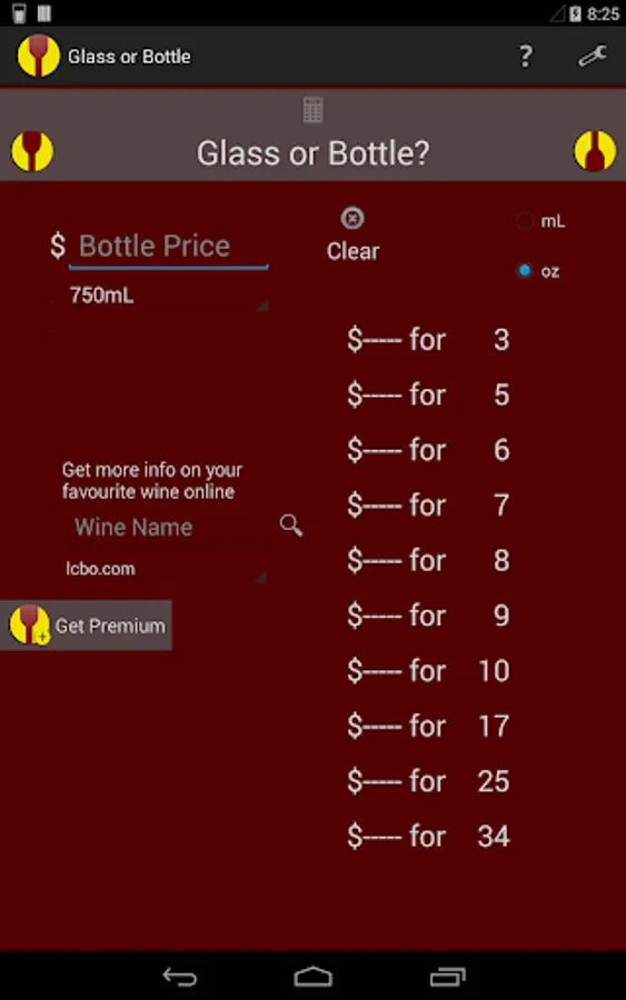 It's a solution to an age old problem. You're at a restaurant and you can't decide whether it's better to buy glasses of wine, or the bottle. Glass or Bottle is an original app that takes the price of the bottle and calculates what a glass should cost.