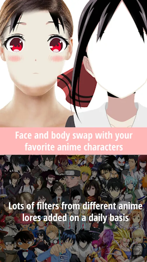 Portray as your favorite anime character in this anime face changer & anime face swap app. Over 10,000+ anime face filters to face swap and face change with.