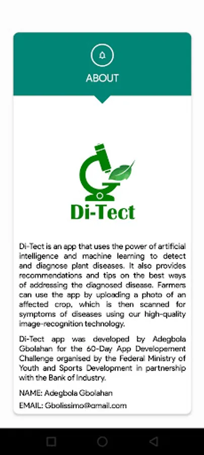Di-Tect app was developed by Adegbola Gbolahan for the 60-Day App Developement Challenge organised by the Federal Ministry of Youth and Sports Development in partnership with the Bank of Industry.