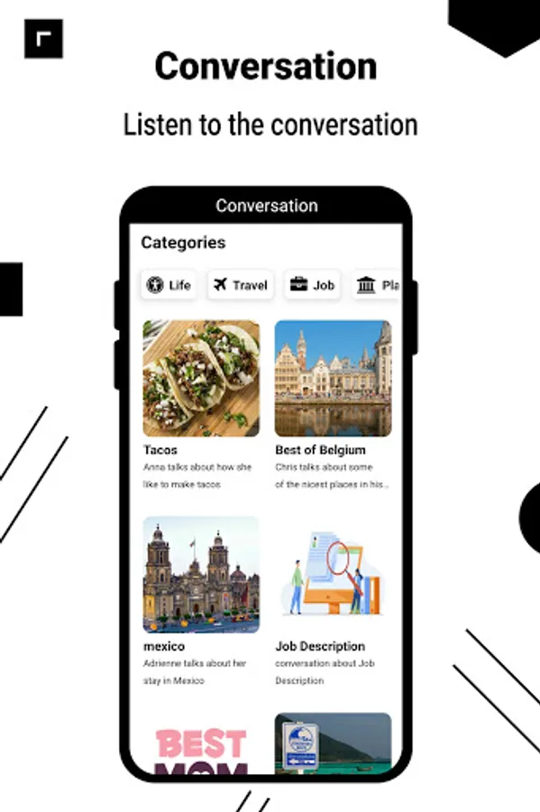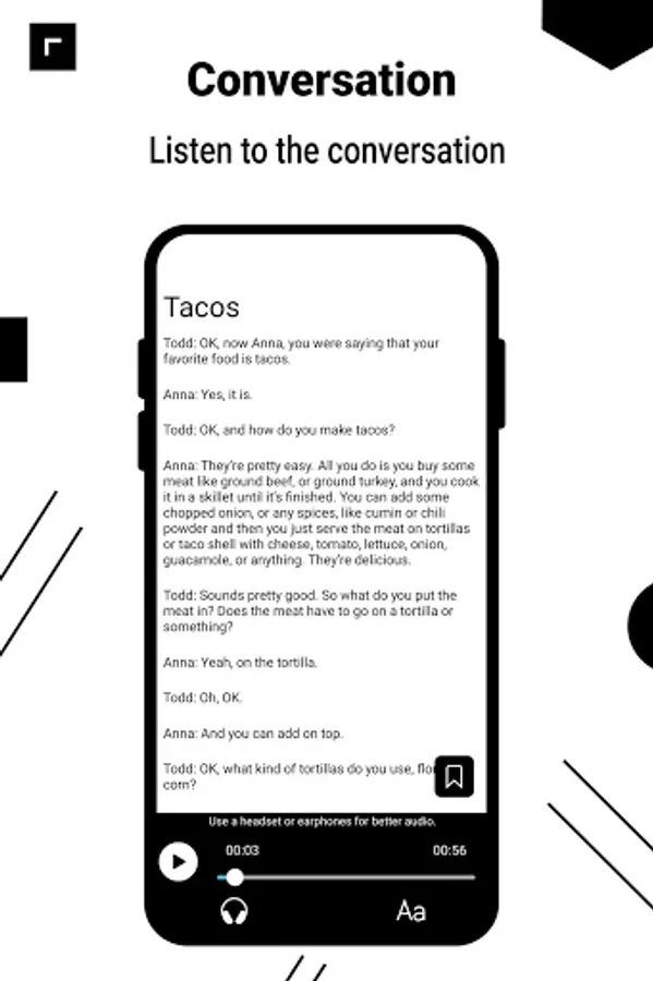 + Listen to conversations: play the entire English conversation with various topics.