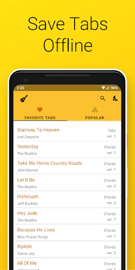 Save songs for offline access by adding them to your Favorites. Quickly find the content you're looking for with a beautiful Material Design built for speed and simplicity. Search hundreds of thousands of available songs by title or author name, 100% free with no ads!
