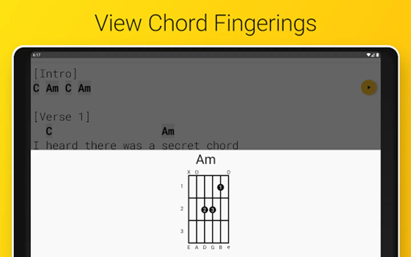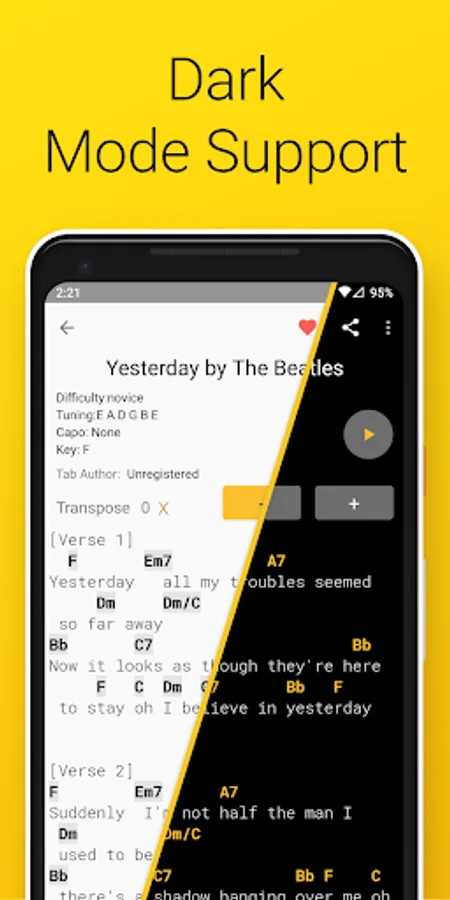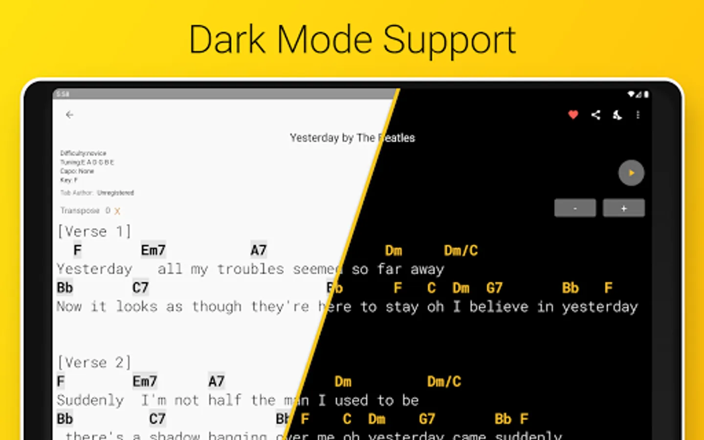 Key changes are as simple as a touch of a button with built in transposition. Or find the fingering for your chord by simply tapping the chord name! Jam at any time of day or night with Dark Mode.