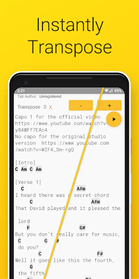 Sort your favorite songs into Playlists, available offline automatically. Rearrange songs, save custom transposition levels, and add the same song more than once!