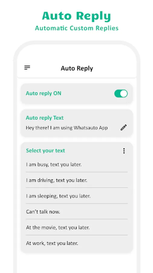✔ Auto Replay (Enable Auto Replay Feature and set auto replay message that you want to send and it's auto send when receive msg on WA)