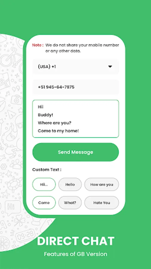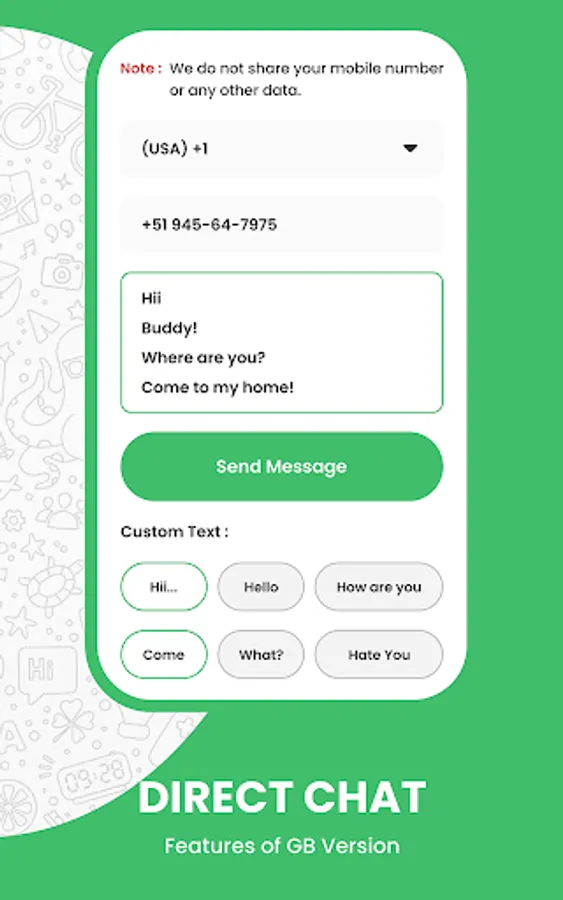 ✔ Direct Chat via this app (Just Enter Number and Send direct message on whatsapp)
