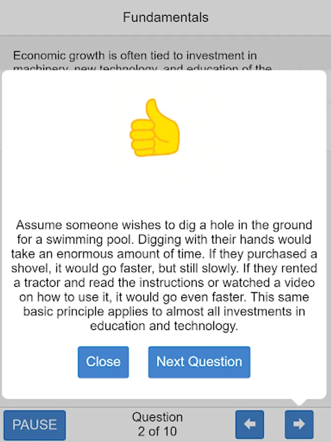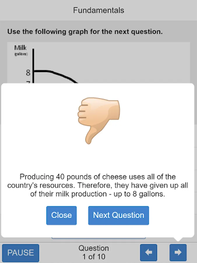 The operation is simple. Choose from one of the 5 domains (fundamentals, micro, macro, international trade, or personal finance) and you will get assigned 10 random questions. Instant feedback is provided after each question whether it is answered correctly or incorrectly. After the 10 questions are over, you get a score and can immediately try the same domain again, or choose a different domain. Quick, simple, effective.