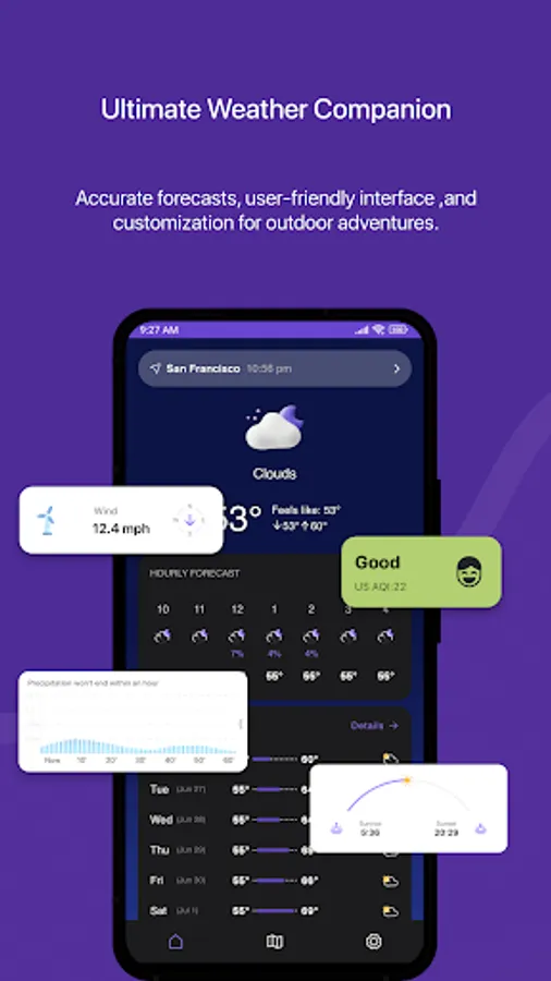 Get up to 16 days of daily forecasts and up to 336 hours (some locations up to 400 hours) of hourly forecasts for your location. You'll find detailed information like temperature, real feel, precipitation probability and amount, humidity, precipitation, cloudiness, UV index, wind speed, pressure, AQI, visibility and more! HeyWeather makes it simple to know when it will rain, snow, or be too hot or cold. You can even check rain intensity within the app.